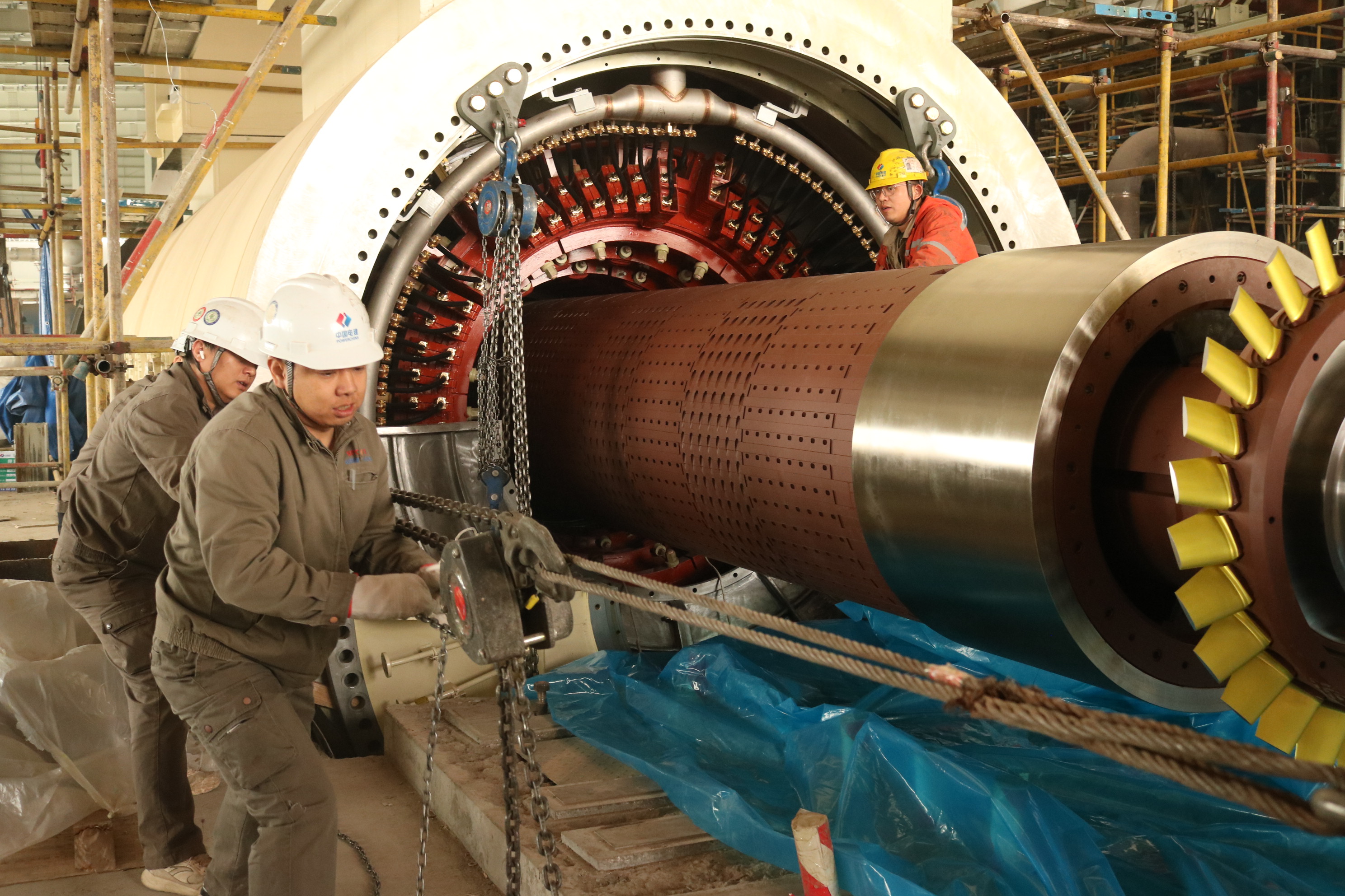 面对超高精度的施工要求,作业前,施工团队在定子内部完成滑轨铺设,为转子平稳穿入搭建基础导向通道。作业中,通过起吊设备将转子精准起吊、平稳送入定子内部,随后切换牵引模式。施工人员全过程对转子进行不间断精细调整,克服大重量吊装与超精密对位的双重挑战。经过全体人员紧密协作,整个穿装过程一气呵成,转子精准到达预定位置,各项技术指标均达到优良标准。